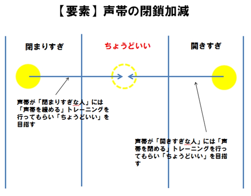 上の図のように「声帯の閉鎖加減が閉まりすぎ」な人には「声帯の閉鎖を緩めるトレーニング」を行ってもらい「声帯の閉鎖加減がちょうどいい」ように持っていきます。