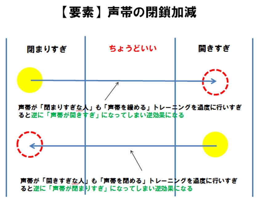 「声帯の閉鎖加減が閉まりすぎな人」でも「声帯の閉鎖を緩めるトレーニング」を行い続けると「声帯の閉鎖が開きすぎ」になってしまうんですよね。